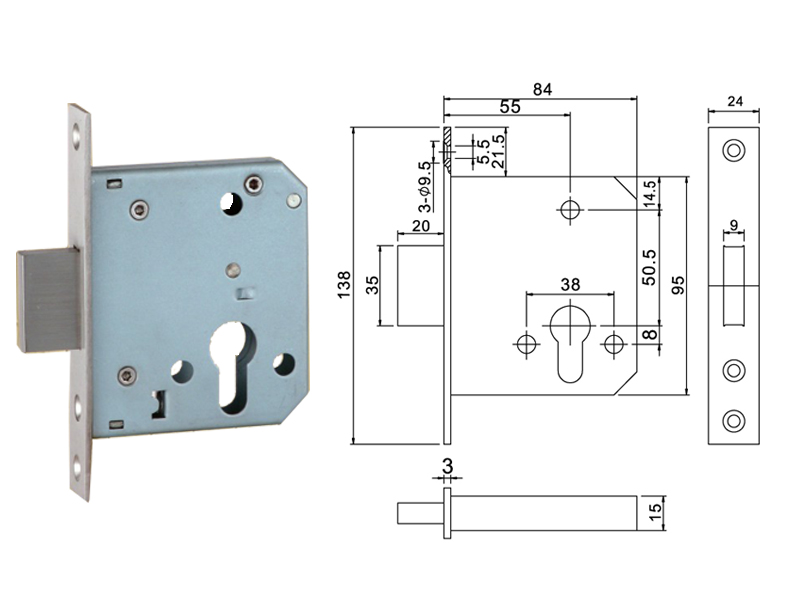 RML-19 55ZD 單方舌鎖體,歐標葫蘆孔,鎖芯開啟方舌