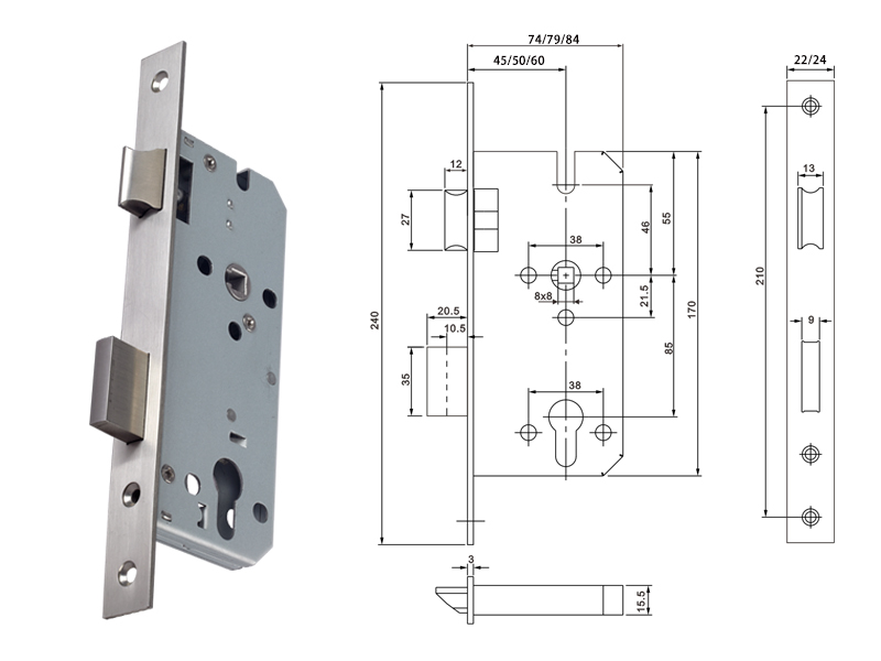 RML-07 45*85 /50*85/60*85 三個(gè)規(guī)格不銹鋼304雙舌鎖體,方舌、斜舌、方孔均不銹鋼304精鑄的