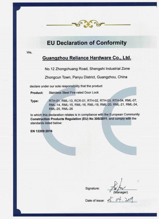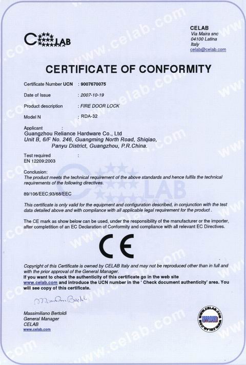 CERTIFICATE Of Stainless Steel Fire-rated Door Lock