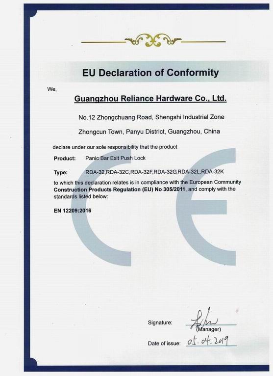 CERTIFICATE Of Panic Bar Exit Push Lock