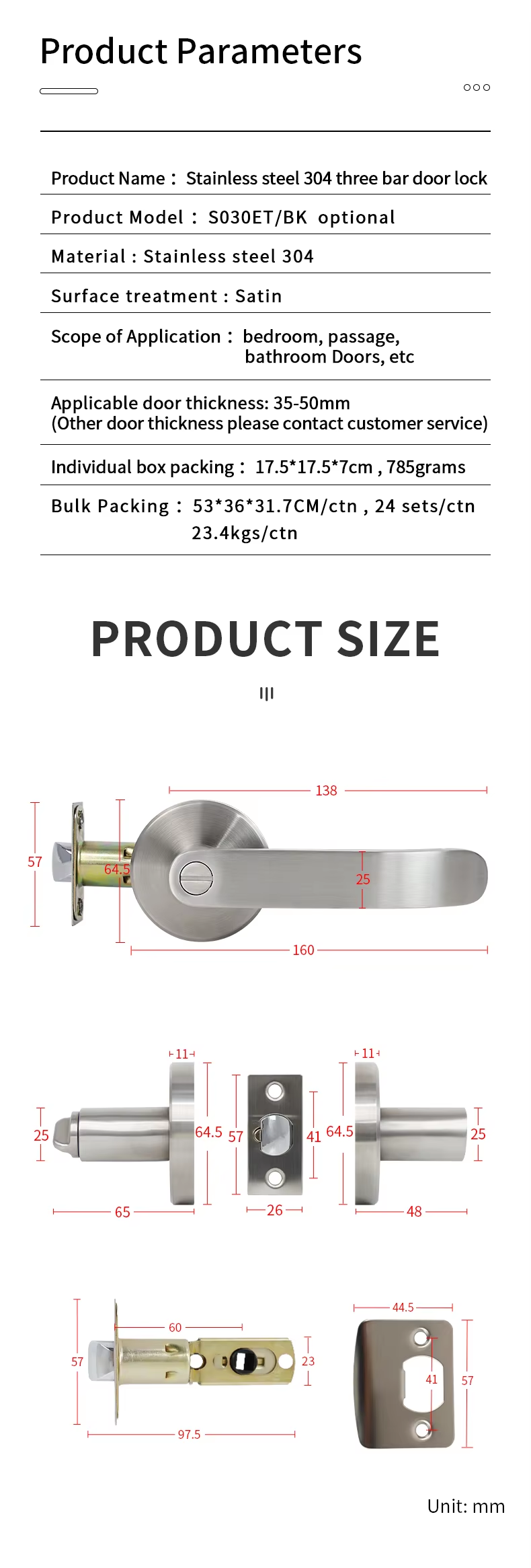 S030BK Keyless Entry Passage Version Tubular Lock SS304 Satin