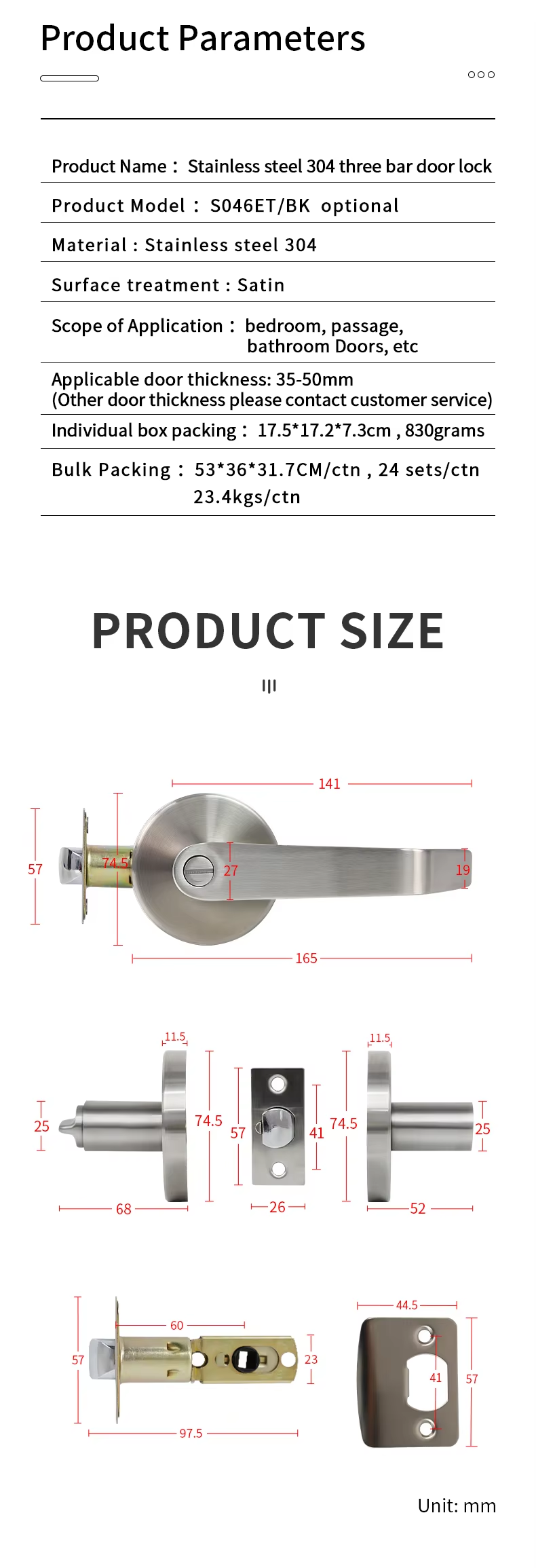 S046 Stainless Steel 304 Tubular Handle Latch Bolt Lock Keyed Model Privacy Door Lock